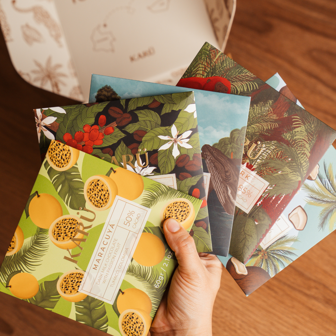 A curated collection of our five most beloved bean-to-bar chocolates. Experience the full spectrum of KARÜ craft from the signature Pacific Dark to the vibrant Maracuyá, bold Jungle Dark, silky Coconut Cream, and aromatic Tintico.